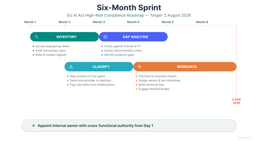Months 2-3: Classification. Map each system against the four gates. Determine whether you are provider or deployer for each. Flag any modifications that may have shifted your role.