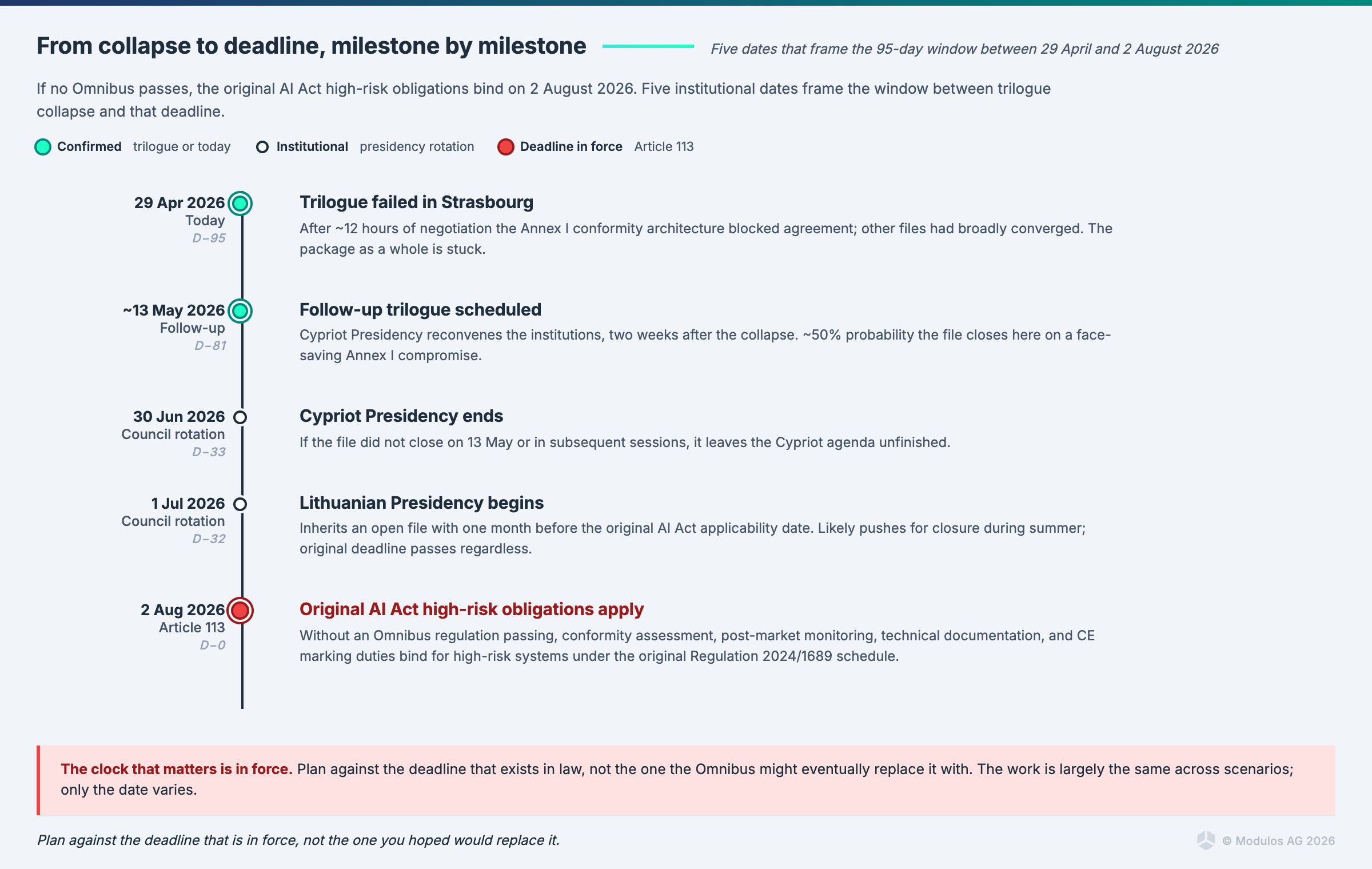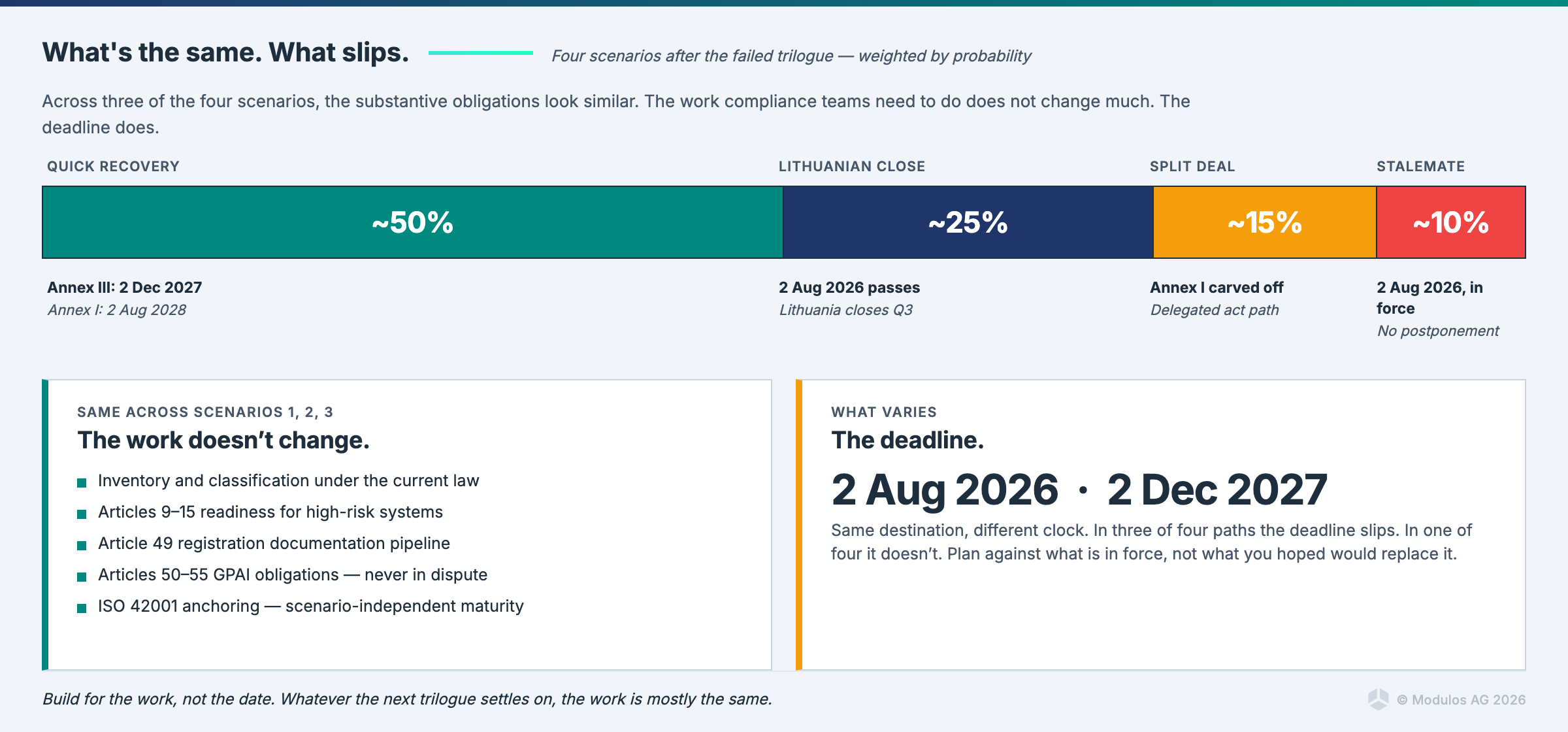 Modulos's position is straightforward: regardless of when or how the trilogue eventually closes, we help organisations build AI governance programs that are robust to the outcome. If the deal closes in May with the previously-converged dates, we help you execute against December 2027. If the deadline holds at 2 August 2026, we help you triage what must be done now versus what can be sequenced. If the deal splits, we help you operate across two clocks at once.
