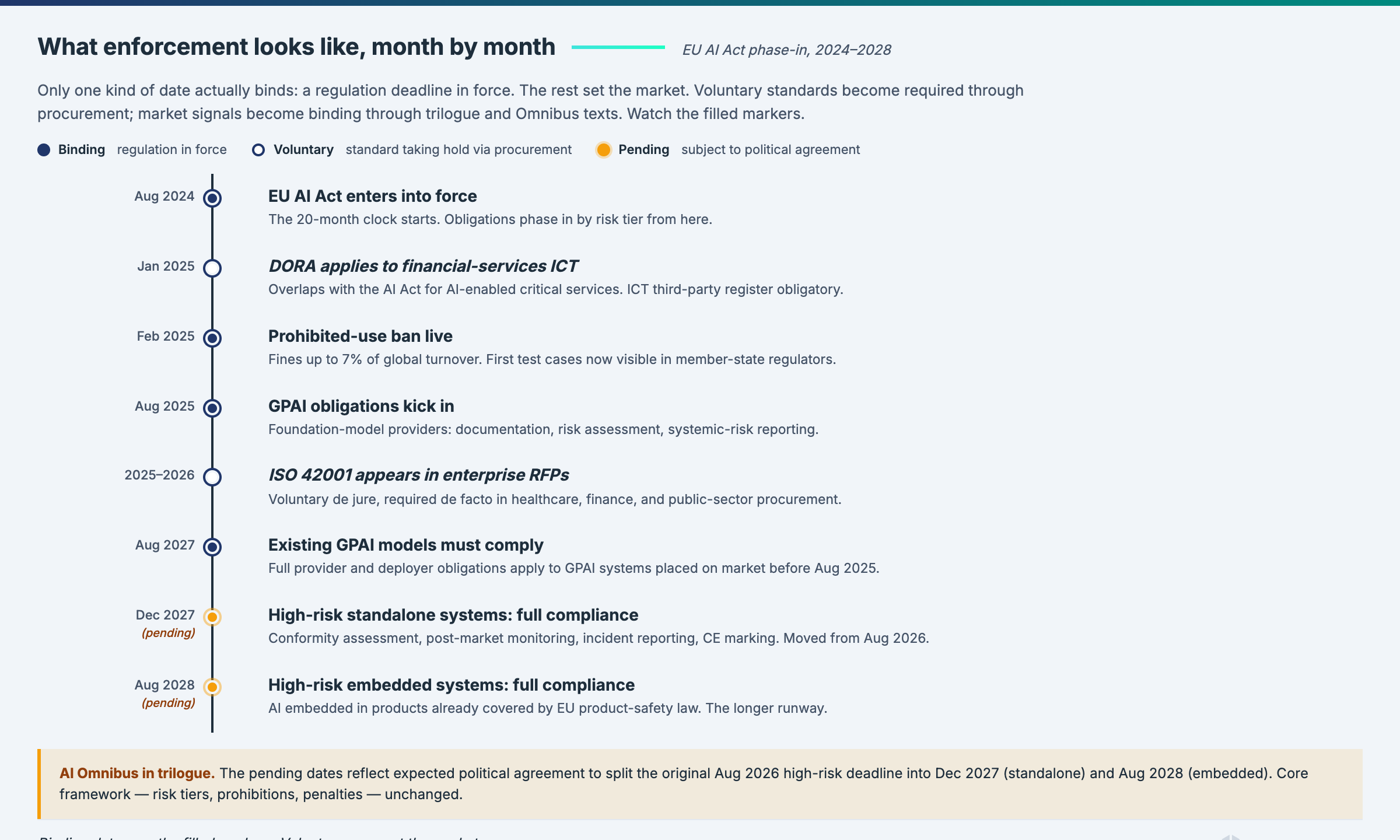 Prohibited practices went into force in February 2025. General-purpose AI obligations went into force in August 2025 for new models, with existing models following in August 2027. High-risk system obligations are on deck, with the baseline date of August 2026 and the Digital Omnibus proposal moving parts of this to December 2027 in certain configurations.