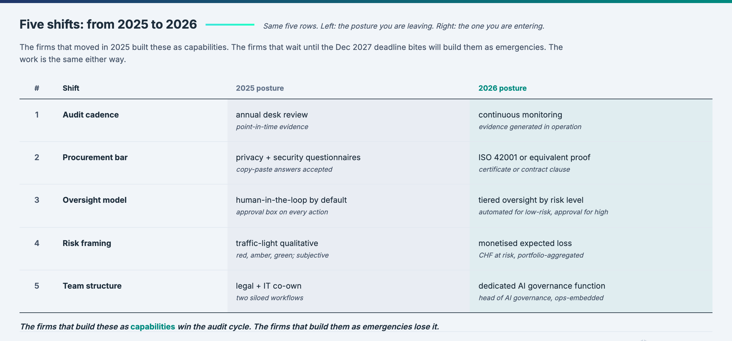 The organisations treating AI compliance as a 2026 problem will be ready for the 2027 pressure. The ones still treating it as a 2024 problem will be retrofitting while their insurance renewal expires and their supervisor asks for evidence they cannot produce.