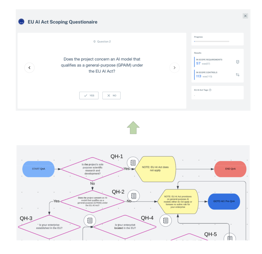 The below figure shows how the questionnaire is presented on Modulos AI Governance Platform, plus how the underlying decision tree flowchart is designed.