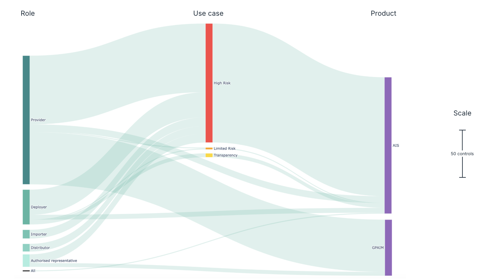 The below diagram (Figure 2) visualizes the Controls flow analysis for the EU AI Act, illustrating how they distribute across different stakeholder roles, use cases, and product types. The width of the flows indicates the relative number of Controls applicable in each case.