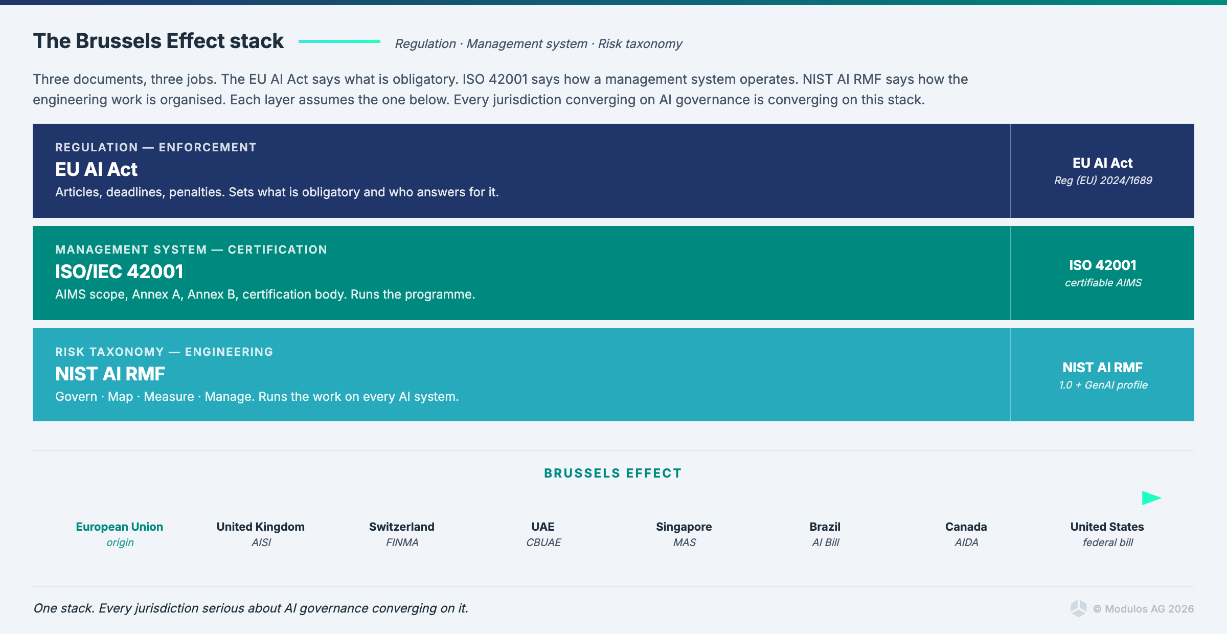 That is the Brussels Effect working in real time, and it is the reason I have stopped taking the question "should we adopt EU AI Act, ISO 42001, or NIST AI RMF" seriously.