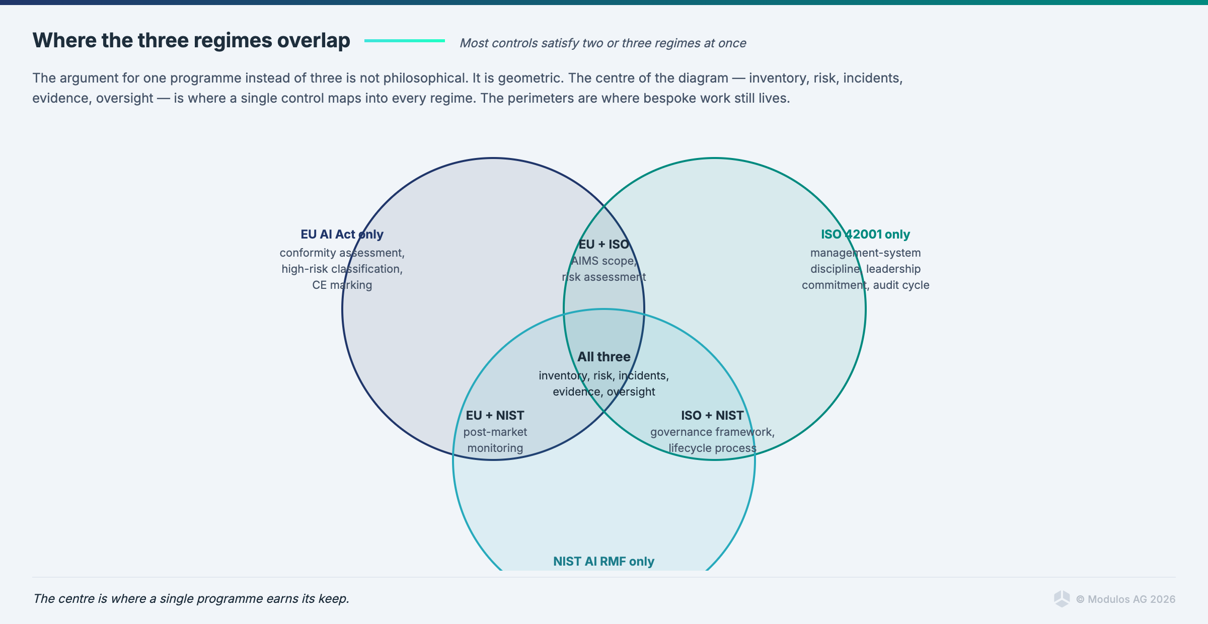 The unit economics are not the full story, though. The deeper win is structural. If your ISO 42001 AIMS is the scaffolding, and your EU AI Act Article 9 risk management sits inside it, and your NIST Map step produces the data that Article 9 needs, you have built one organisation doing one job. Not three organisations each optimising for their own auditor.