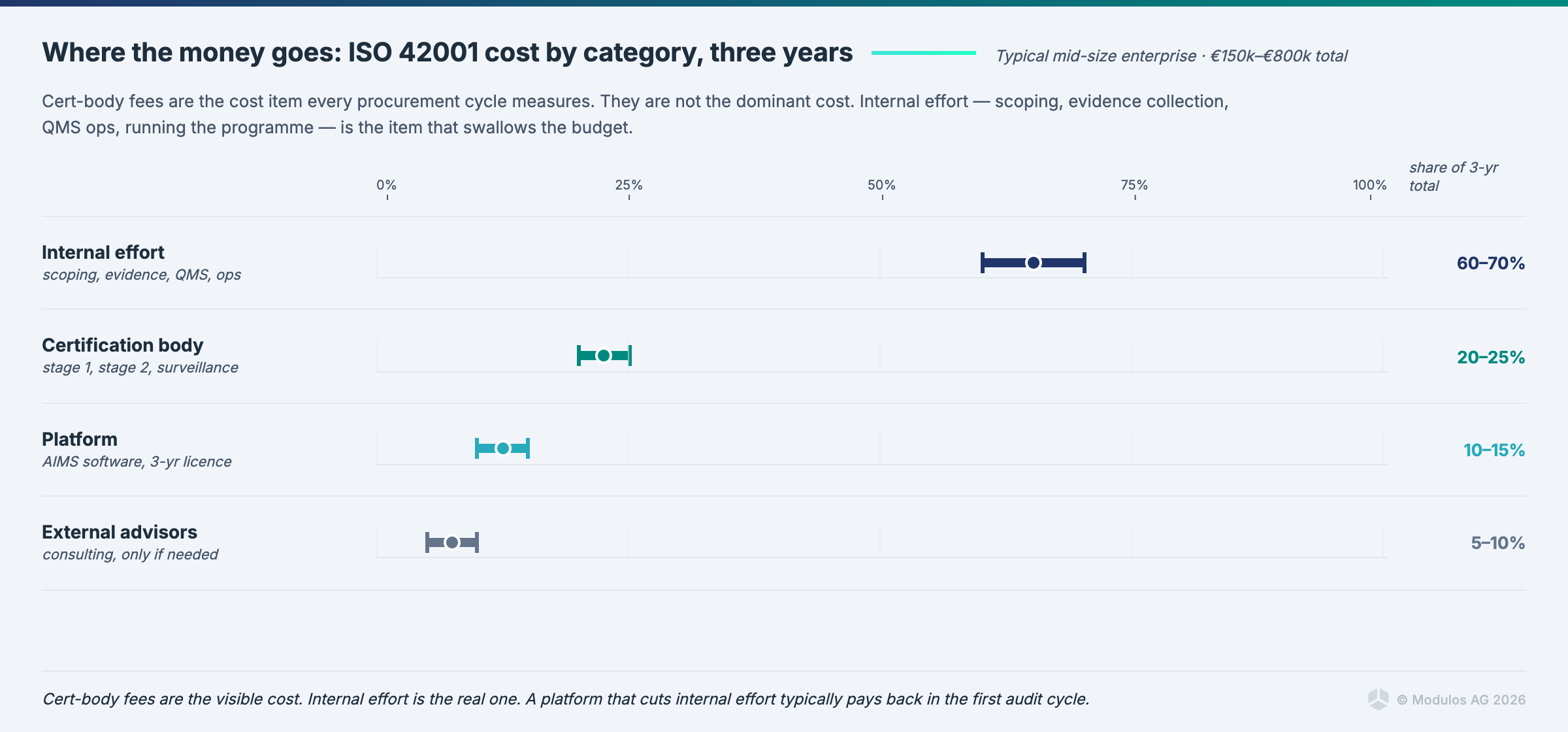 How much does ISO 42001 certification cost? Certification body fees: €15,000 to €60,000 depending on scope. Internal effort: €60,000 to €300,000 fully loaded for 3 to 6 months. Platform and advisory costs: variable. Surveillance audits: 30 to 50% of initial cost per year.
