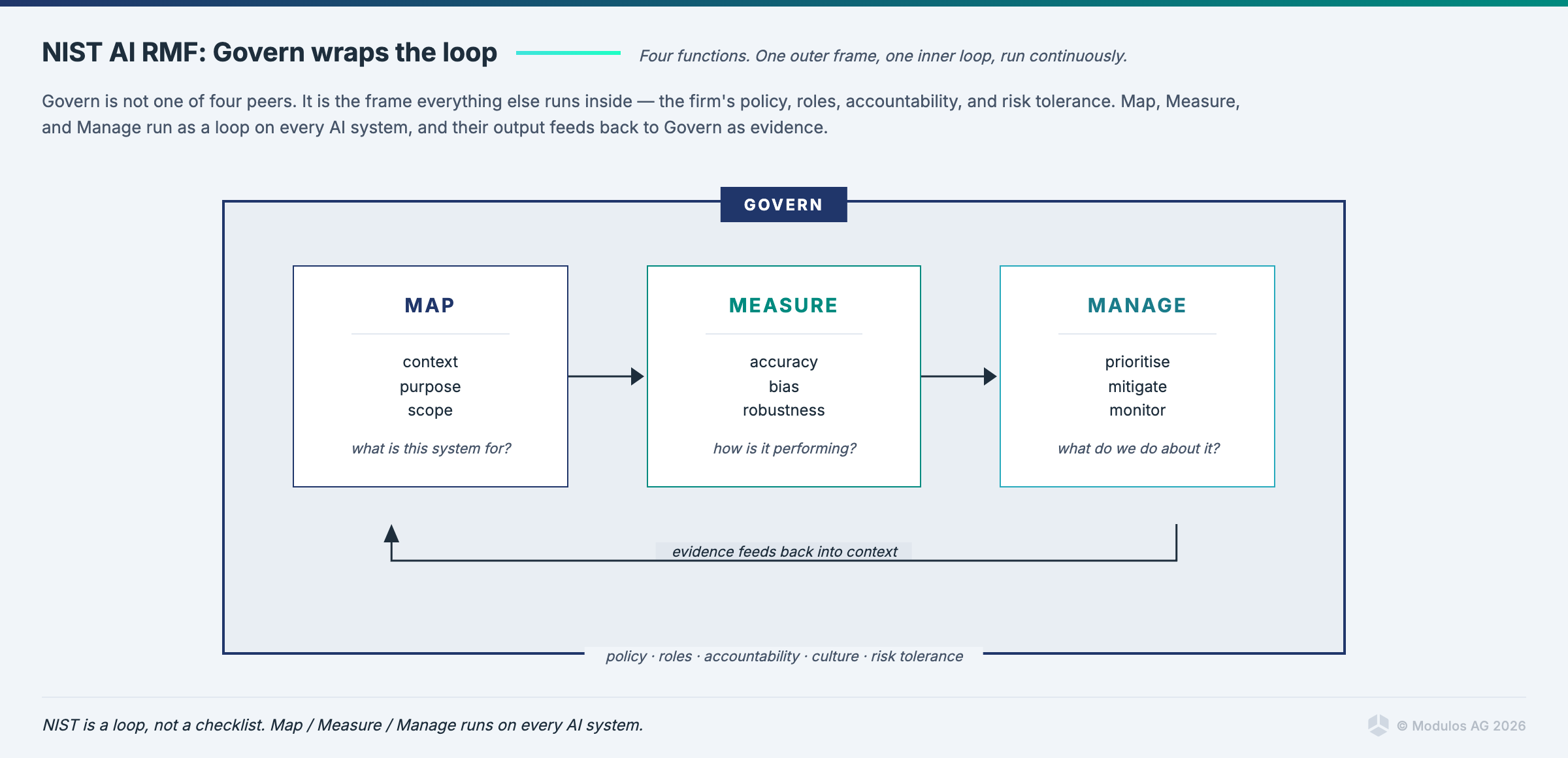 Ready to see how Modulos operationalises the NIST AI Risk Management Framework for your organisation? Request a demo and we will walk you through how Govern, Map, Measure and Manage become real controls and real evidence on the AI risk management platform.