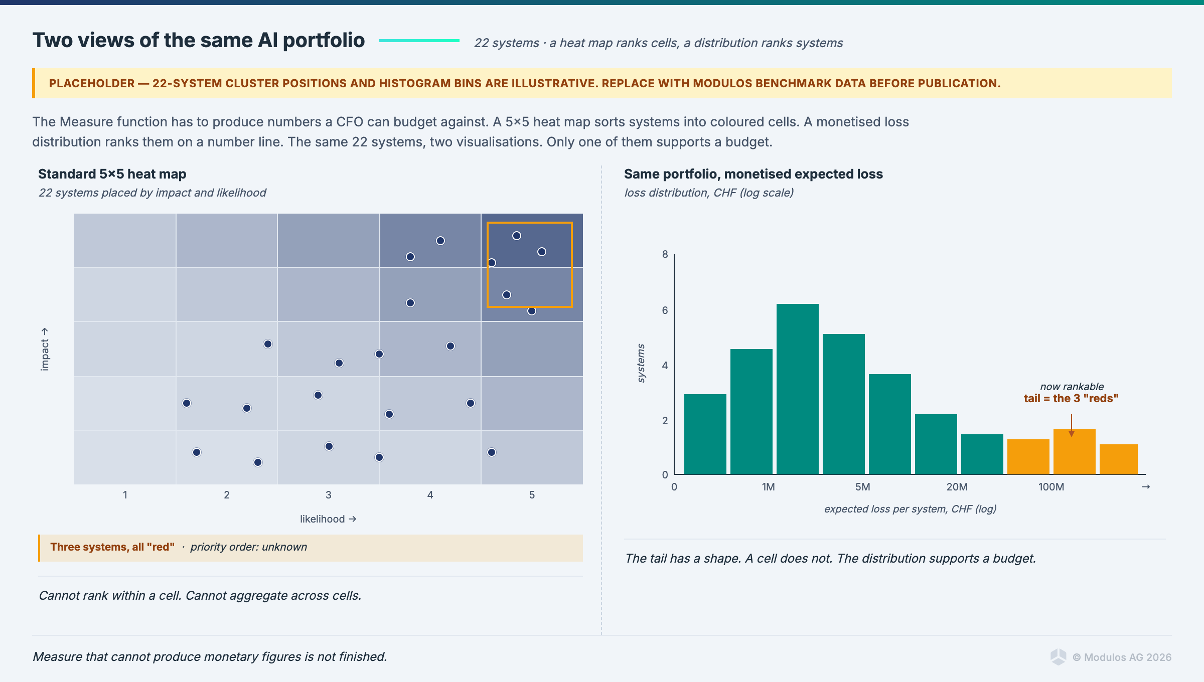 A Measure function that cannot put a euro figure on the downside of a given risk is not finished. Not because monetary quantification is always accurate (it is not), but because the discipline of asking "what would this actually cost" forces clarity. Traffic-light dashboards do not. A red traffic light and a red traffic light on different risks tell you nothing about which to treat first. €4.2 million of expected annualised loss versus €180,000 tells you clearly.